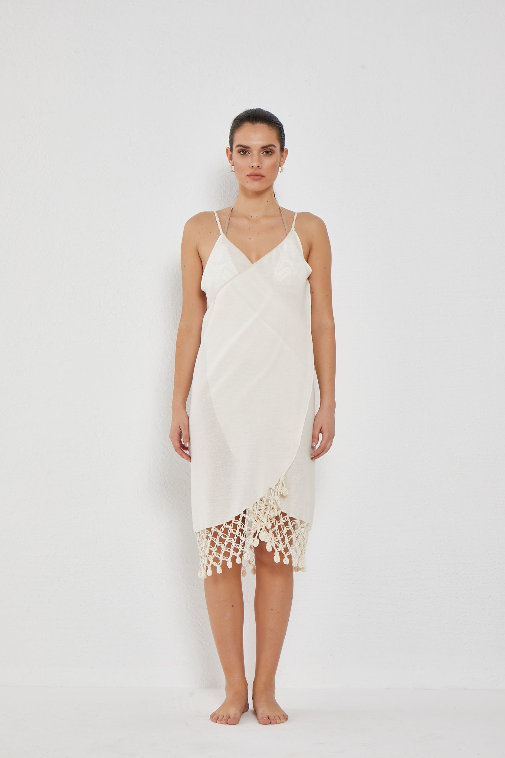 The GAIA is a simple wrap-style beach cover up with handcrafted detailing decorating the edges.